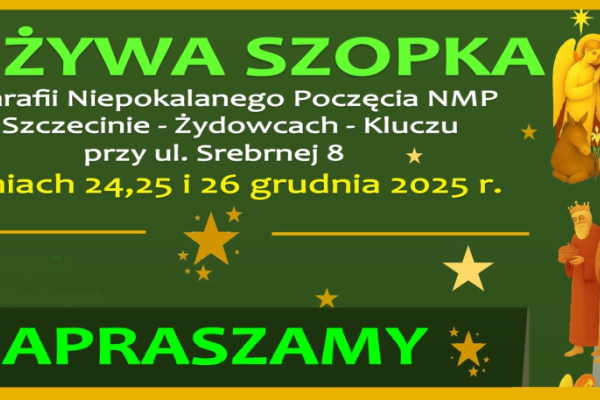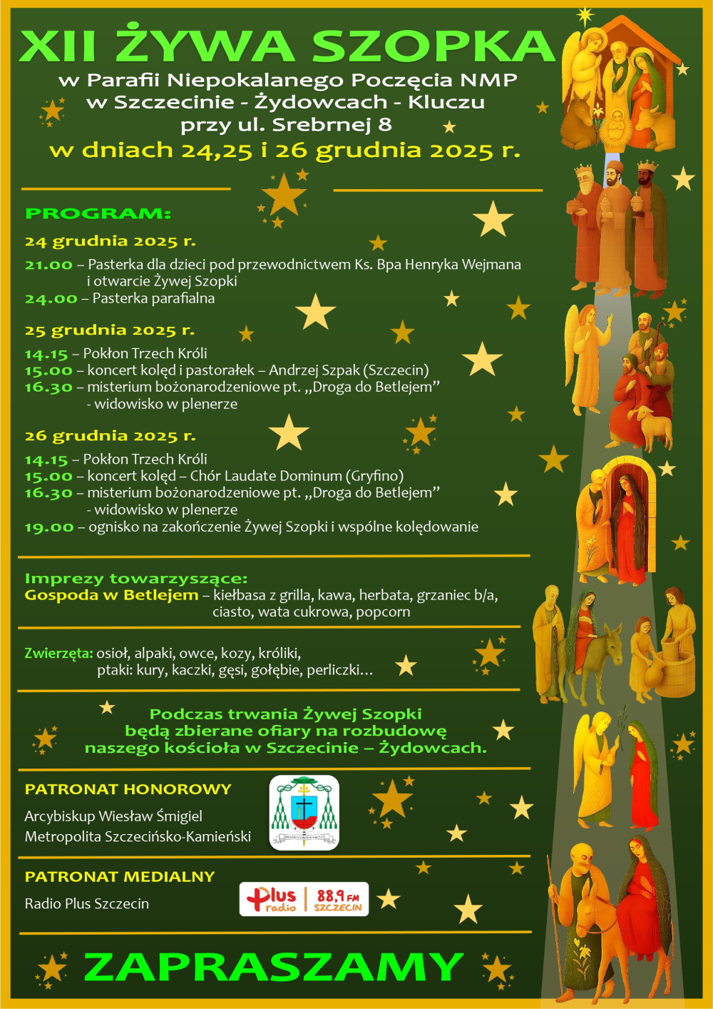 Wraz z ks. proboszczem Janem Dziduchem SChr zapraszamy już w noc Bożego Narodzenia… Otwarcie Żywej Szopki nastąpi wraz z Pasterką dla dzieci o godz. 21 pod przewodnictwem bpa Henryka Wejmana, biskupa pomocniczego archidiecezji szczecińsko-kamieńskiej (tyt. Sinitis). W pierwszy i drugi dzień Świąt przewidziane są różne atrakcje, m.in. koncerty kolęd i pastorałek, przedstawienia jasełkowe. Na zakończenie w dniu św. Szczepana zaplanowano wspólne ognisko ze śpiewaniem kolęd.