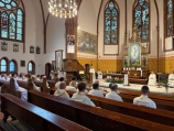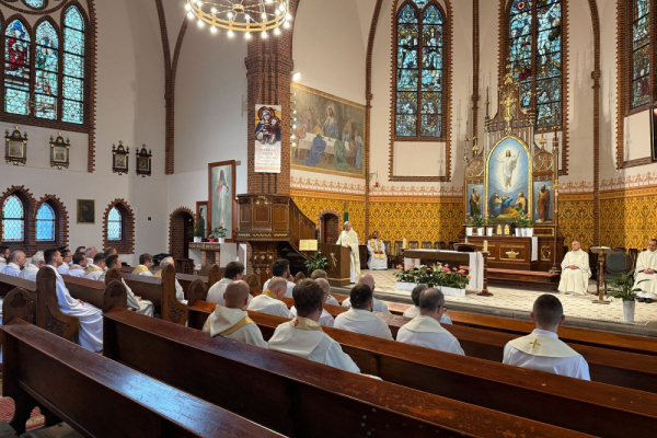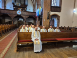 Adoracja Najświętszego Sakramentu, stanowiąca kolejny punkt programu skupienia, była okazją do osobistej modlitwy i skorzystania z sakramentu spowiedzi. Uroczysta Msza Święta wieńczyła i stanowiła kulminację wspólnie przeżytego czasu na pogłębianie relacji z Bogiem i Współbraćmi. Przewodniczył jej i okolicznościową homilię wygłosił nasz Gość. W homilii zwrócił naszą uwagę na dobre wykorzystanie czasu, który daje nam Bóg. W tym czasie towarzyszy nam Maryja – Matka naszej nadziei. W oparciu o Ewangelię ukazującą scenę odnalezienia Pana Jezusa w świątyni nakreślał pielgrzymkę wiary Świętej Rodziny, a także przestrzegał, by nasza pielgrzymka na ziemi nie opierała się zbytnio na przyzwyczajeniu i rutynie, pytając, co robić gdy w naszych działaniach brakuje wiary – jest rutyna? Pospieszył również z odpowiedzią, którą jest modlitwa Świętego Karola de Foucauld: Mój Boże, jeśli jesteś, spraw bym Cię poznał. Zatem nasze myśli i pragnienia kierujemy ku Panu Bogu – a więc ku Temu, który może coś zrobić! A kiedy patrzymy na Maryję, która z bólem serca szuka Jezusa i znajduje Go – zauważamy, że ból mija. Znalezienie Jezusa jest zawsze kluczowe.