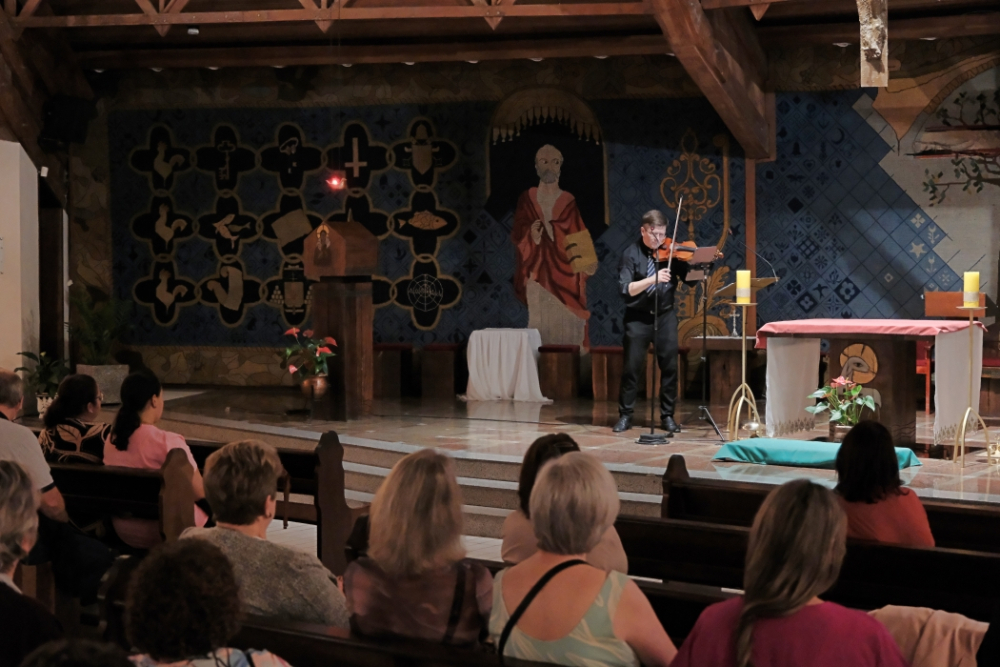 Nasz koncert rozpoczął się bezpośrednio po Mszy Świętej, podczas którego zgromadzeni mogli wsłuchać się w piękno muzyki sakralnej i klasycznej i podziwiać mistrzowskie wykonania utworów J. S. Bacha, F. Schuberta, H. Villa-Lobosa, J. Polaczyka, K. Niegowskiego i N. Paleja. Panu Mariuszowi towarzyszył brazylijski pianista Durval Cesetti oraz parafialny zespół „Vox Apostolorum”. Szczególne wzruszenie wywołało wykonanie na skrzypcach pierwszego hymnu Polski „Bogurodzicy”, ponadto niezapomnianym momentem było wspólne odśpiewanie ulubionej pieśni Jana Pawła II „Barki”. Towarzyszące wykonaniom komentarze pana Mariusza oraz interpretacja utworów nadały całemu wydarzeniu wymiar świadectwa wiary i wspólnotowej modlitwy.