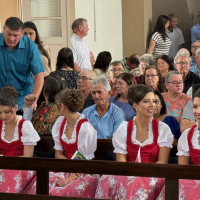 Wróćmy jednak do niedzielnych wydarzeń… Liturgia rozpoczęła się uroczystą procesją do głównego ołtarza. W procesji niesiono duży i już stary obraz Pani Jasnogórskiej oraz , portret św. Jana Pawła II. Te wizerunki poprzedzały grupę dzieci w kolorowych koszulkach (o których już wspomniano powyżej), nadzwyczajnych szafarzy Komunii Świętej oraz ministrantów. Do procesji włączył się również przybyły z miasta São Bento do Sul zespół folkloru polskiego Hercílio Malinowski. (To odległe o 30 km miasto liczy ponad 80 tys. mieszkańców, w tym 25 tys. osób polskiego pochodzenia). I trzeba przyznać szczerze, że jednym z wyróżników tej wspólnoty wydaje się być bardzo głośny i gromki śpiew polskich pieśni religijnych oraz poprawny język polski w śpiewanych pieśniach, odczytywanych czytaniach podczas liturgii słowa i wezwań modlitwy powszechnej. Podziwiałem tę poprawną polszczyznę i można było odczułem, że kościół wypełniony wiernymi śpiewał i modlił się z głębi polskiej duszy, w duchu wielkiego przeżycia duchowego.