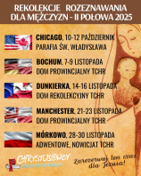 Przez cały listopad 2025 r., w kolejne weekendy, w naszych europejskich prowincjach organizowano specjalne zjazdy formacyjne dla młodych mężczyzn – «Rekolekcje Rozeznawania dla Mężczyzn», które organizował nasz referat powołaniowy. Do Bochum, Dunkierki i Manchesteru przybyli młodzi w różnym wieku (od maturzystów po doktorantów), aby pod kierunkiem ks. Sebastiana Stawiereja SChr, moderatora referatu, przez modlitwę, adorację i medytację słowa Bożego wejść w głąb siebie i móc usłyszeć głos Pana, który odpowiada na ludzkie pytanie i wołanie Panie spraw, aby był tam, gdzie Ty chcesz! W końcu w ostatni listopadowy weekend, tj. na początek Adwentu, takie spotkanie odbyło się w naszym domu nowicjackim w Mórkowie.