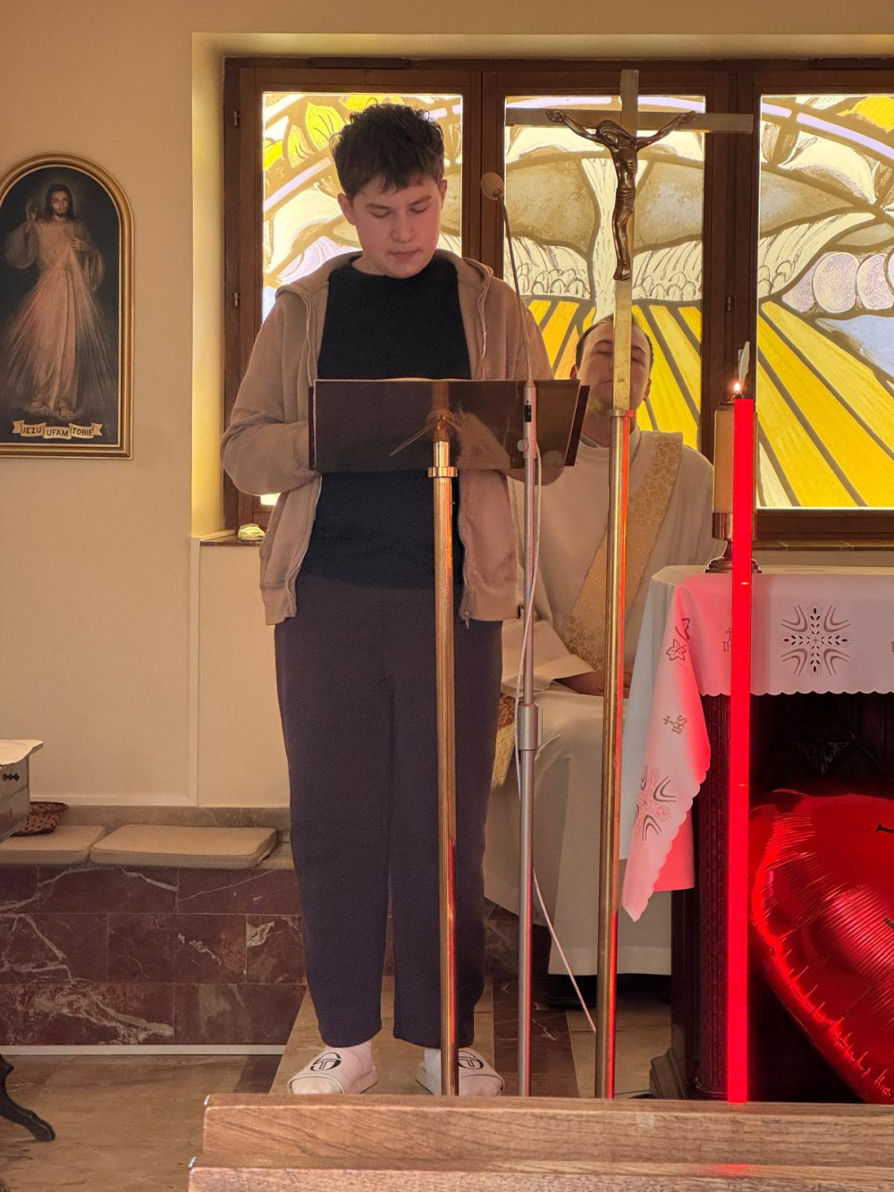 Spotkanie poprowadzili przybyli z Poznania goście: ks. Michał Kłos SChr – prefekt naszego zakonnego seminarium oraz jego alumni: dk. Wiktor Stankiewicz SChr oraz klerycy roku II Paweł Jagła i Adam Szalony. O oprawę muzyczną modlitw zadbała schola z Roubaix, której śpiew towarzyszył uczestnikom podczas liturgii, adoracji i wspólnych modlitw.